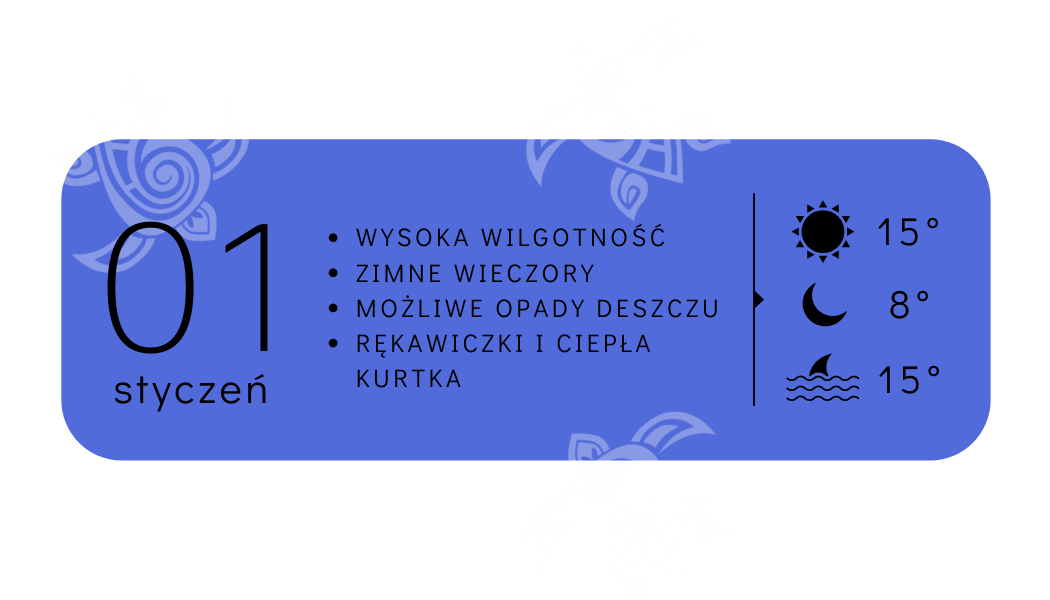 Grudzień na Zakynthos to miesiąc gdzie w powietrzu czuć świąteczny klimat. Czego brakuje? Śniegu! Na Zante to szalenie rzadkie, ale nie niemożliwe aby zobaczyć tu odrobinę białego puchu. Maksymalna temperatura powietrza za dnia sięga 14 stopni Celsjusza, wieczorami natomiast szaliki i rękawiczki są obowiązkowe – pomimo ok. 8 stopni temperatury, bardzo wysoka wilgotność powietrza sprawia , że nawet w najgrubszej kurtce przeszywa nas od środka chłód! Warto mieć pod ręką parasol, bo pogoda lubi się dynamicznie zmieniać. No i tak wracamy do sezonu z grzanym winem w roli głównej 😉