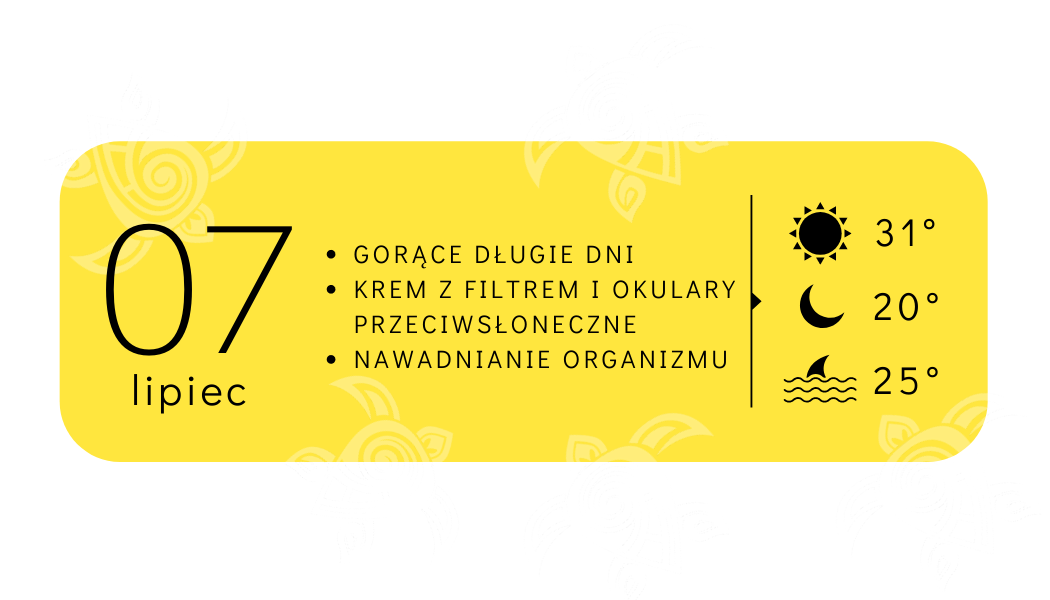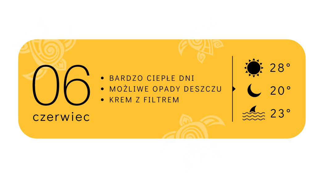 Podręcznikowe greckie lato… czas start! Czerwiec na Zakynthos to początek wysokich temperatur, które raczej nie spadają poniżej 25 stopni w ciągu dnia. Krótkie spodenki, czapka z daszkiem i strój kąpielowy to nieodłączne elementy codziennego ubioru. W czerwcu na Zakynthos słońce towarzyszy nam od rana do wieczora, musimy jednak pamiętać, że niespodziewane burze mogą przerwać nam wakacyjny relaks. Nagłe opady deszczu jednak nie stoją na przeszkodzie, by korzystać z większości lokalnych atrakcji, a jak wiecie – nam krople deszcze nie straszne! Wieczory są bardzo przyjemne.