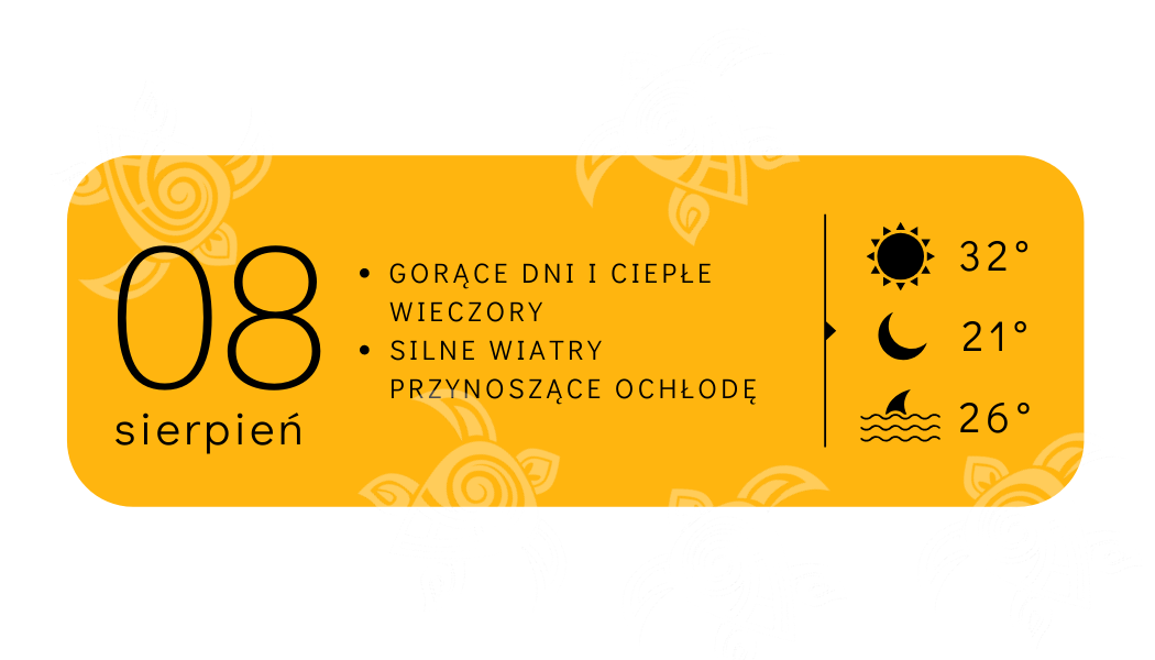 W lipcu i w sierpniu na Zakynhtos wszystkie określenia i synonimy słowa „upał” cisną się nam na usta… Skwar, gorąc, żar, tropiki, parówka.. no, jednym słowem: jest gorąco! Dla miłośników wysokich temperatur to prawdziwy raj 😊 Woda w morzu na Zakynthos sięga nawet do 25-26 stopni Celsjusza. Jeśli nie uda się nam schłodzić w morzu, wtedy możemy liczyć na pomoc wiatrów: Meltemi i Maestro (nie mylić z nazwami wina w jednej z naszych ulubionych winiarni!). Przynoszą one ochłodę w upalne dni, ale potrafią też pokrzyżować plany naszych rejsów. Nieodłącznym atrybutem każdego mieszkańca wyspy są nieustannie okulary przeciwsłoneczne.