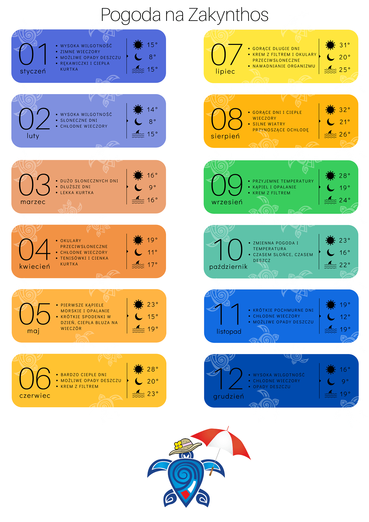 o temperaturę powietrza oraz wody w morzu na Zakynthos. Przedstawiamy krótką charakterystykę pogodową na każdy miesiąc z uwzględnieniem średnich temperatur powietrza w ciągu dnia, nocy oraz wody. Przygotowane na podstawie pogodowych obserwacji z ostatnich trzech lat.